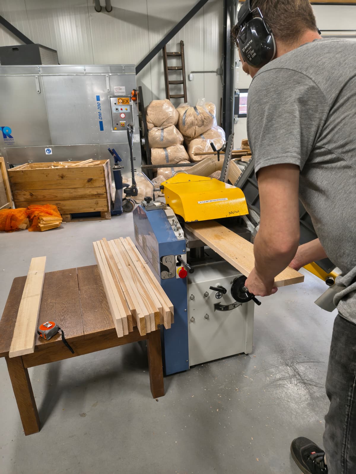 Wanneer wij een opdracht hebben wordt dit hout klaargemaakt door de timmerman / -vrouw die het project tot een eindpunt brengt. Dit houdt in dat we het controleren op ijzer met een metaaldetector, op maat schaven, op breedte zagen en uiteindelijk afkorten naar de juiste lengte. En dan natuurlijk berwerken in een mooi project voor de klant.
