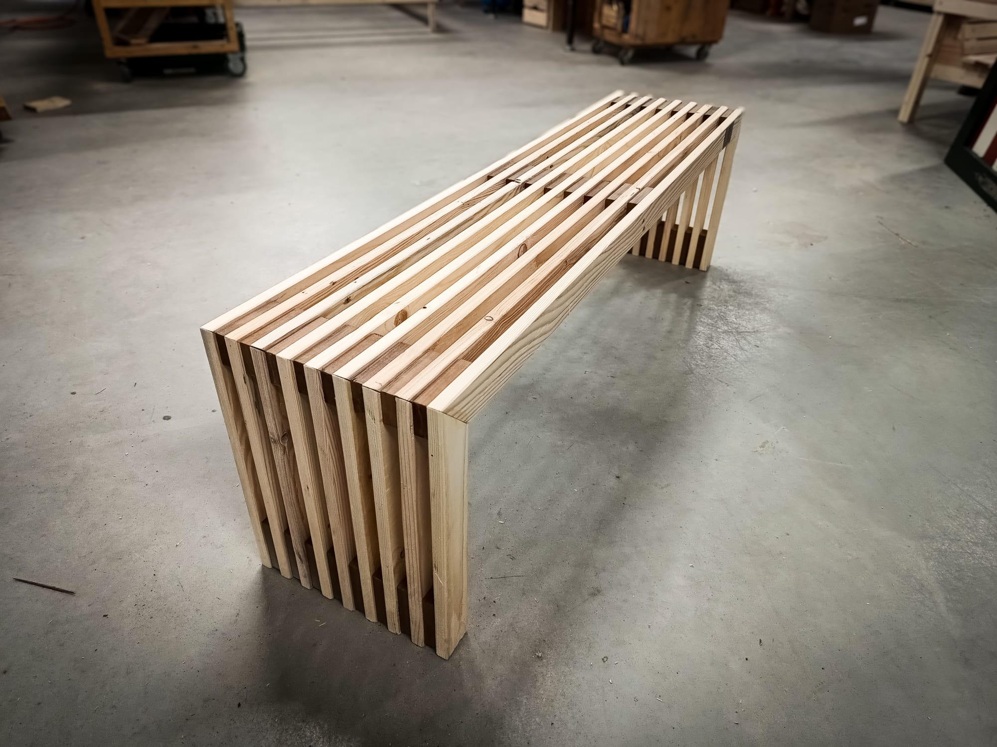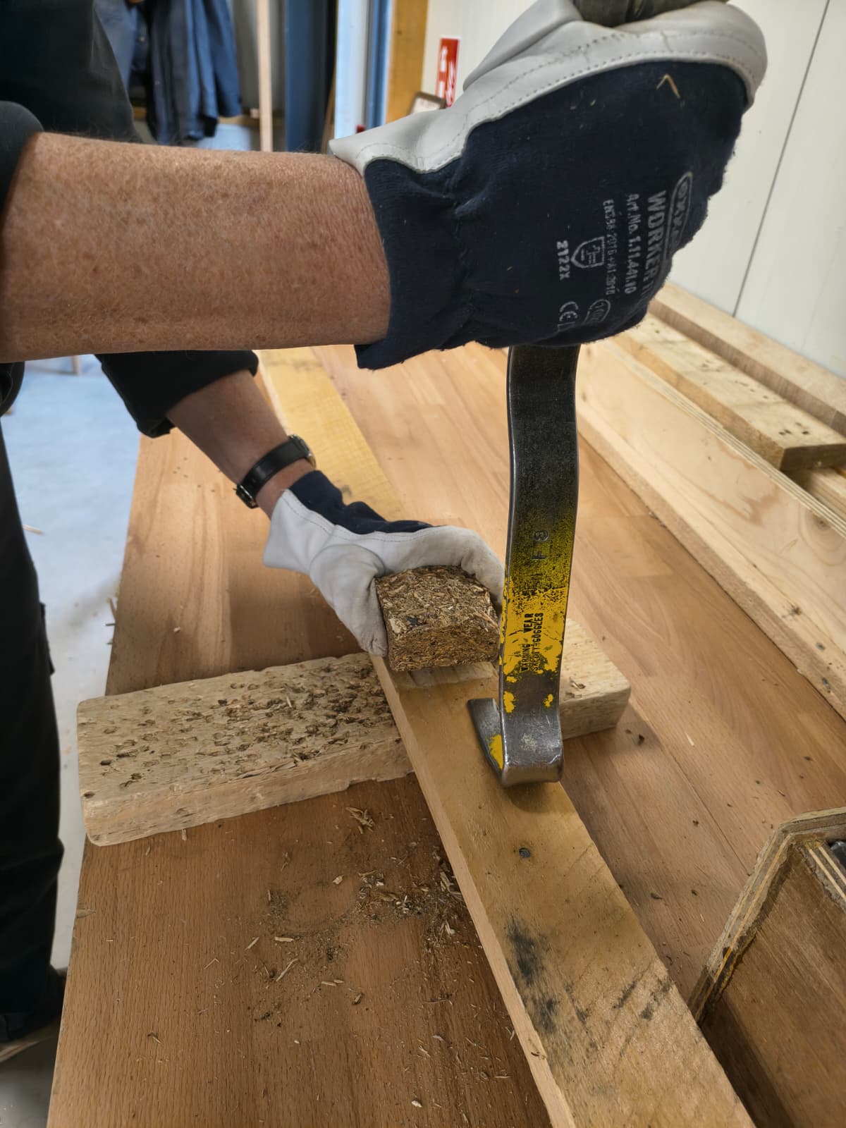 Wij krijgen het hout van een betrouwbare bron in Olst en stallen dit. Daarna komt het naar binnen en zorgt onze blinde timmerman dat het pallet vakkundig en netjes uit elkaar wordt gehaald. Hierdoor ontstaat een mooie stroom aan planken.
