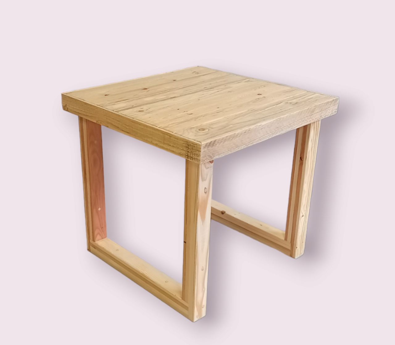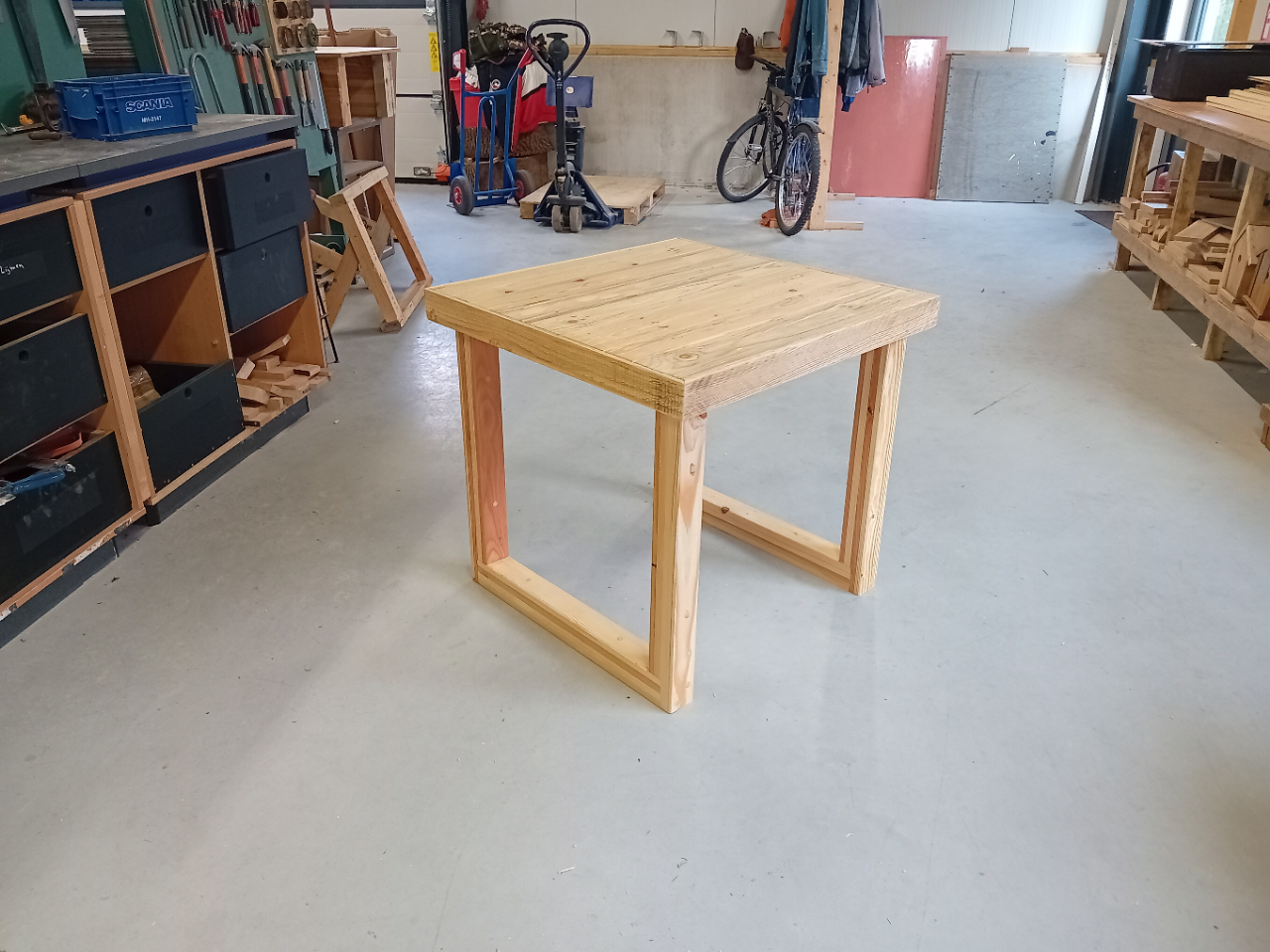 Deze uitvoering is 80 x 80 cm en heeft een hoogte van 74 cm. Afgewerkt met een matte houtsealer.
